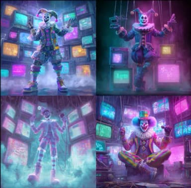 - Persona: Eerie jester/harlequin pulling marionette strings on locked computers, glowing stage.