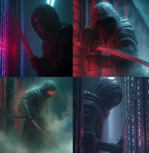 - Persona: Shadowy ninja/samurai figure with code “blades” and enterprise firewall shields.
