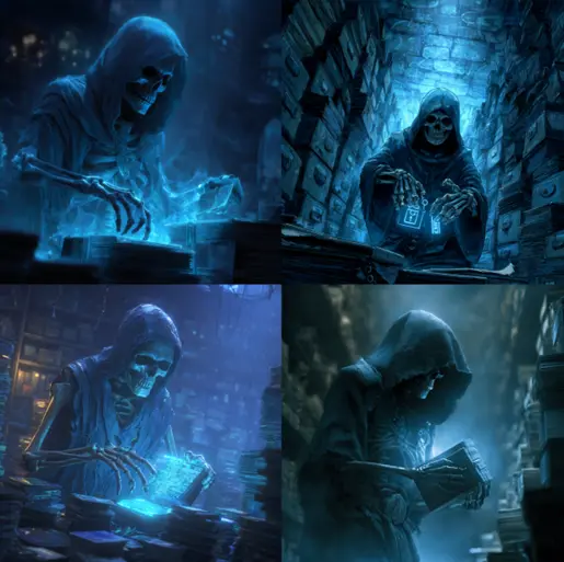 - Persona: Hooded treasure hunter with spectral hands holding stolen data and digital keys.