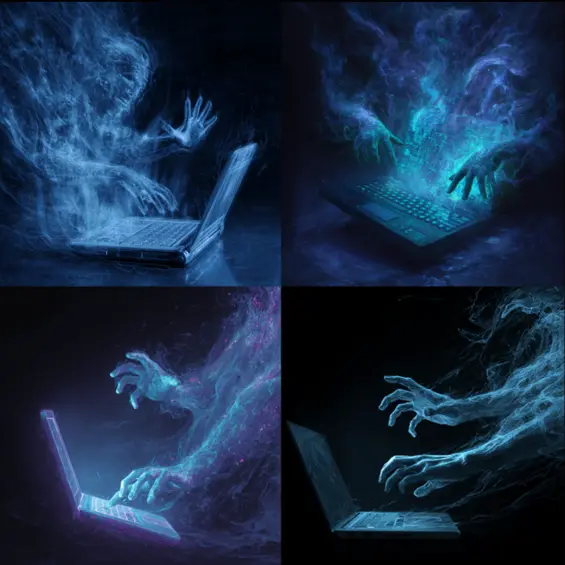 - Persona: Ghostly wraith emerging from a compromised laptop, swirling credentials into a digital void.