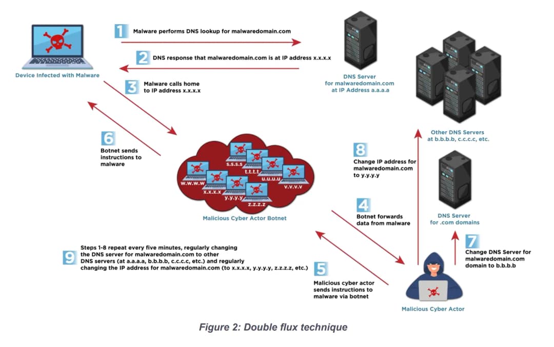 There are two variants: single flux, which changes the IPs behind a domain, and double flux, which also rotates the DNS name servers. Both approaches rely on networks of compromised devices, often forming large botnets that serve as proxies for malicious activity.