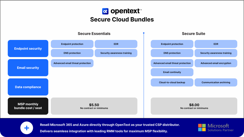 OpenText operates as both a security vendor and a Microsoft CSP distributor. This gives MSPs a single, trusted source for both productivity and protection.
