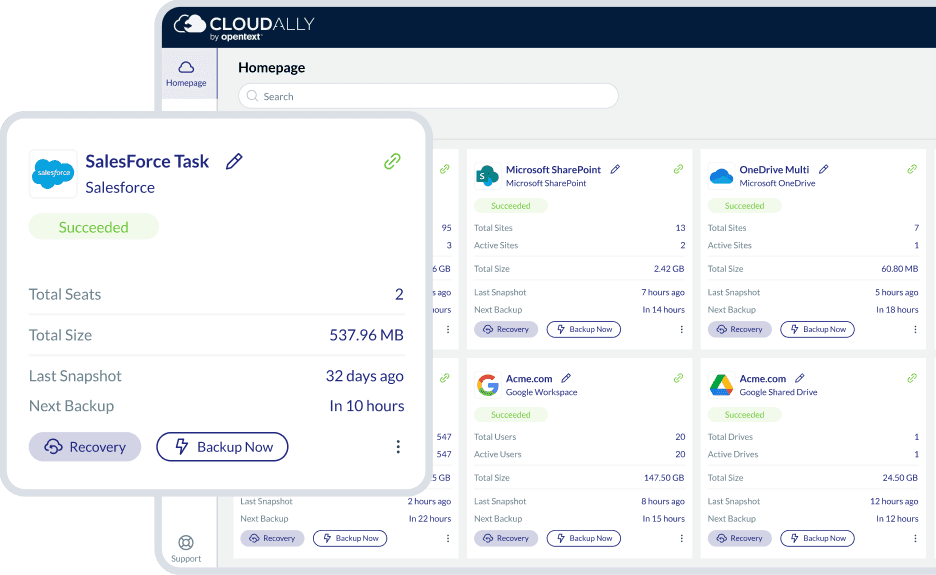 Our Salesforce backup integrates seamlessly with all Salesforce plans, giving you full control of your Salesforce data through a single OpenText Cloudally Backup account. Back up data from Production, Sandbox, and multiple Salesforce instances with ease. The intuitive user interface enables quick, out-of-the-box usage with two-click recovery. Salesforce administrators also benefit from advanced user management, customizable cloud-to-cloud backup settings, transparent status monitoring, email alerts, and detailed activity logs.