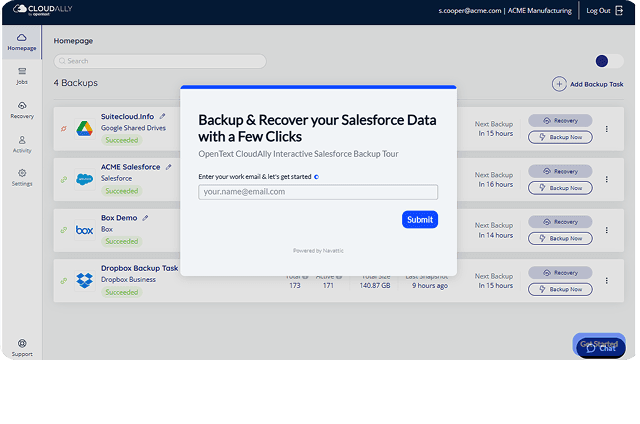 Interactive product tour for OpenText Cloudally Backup for Salesforce.