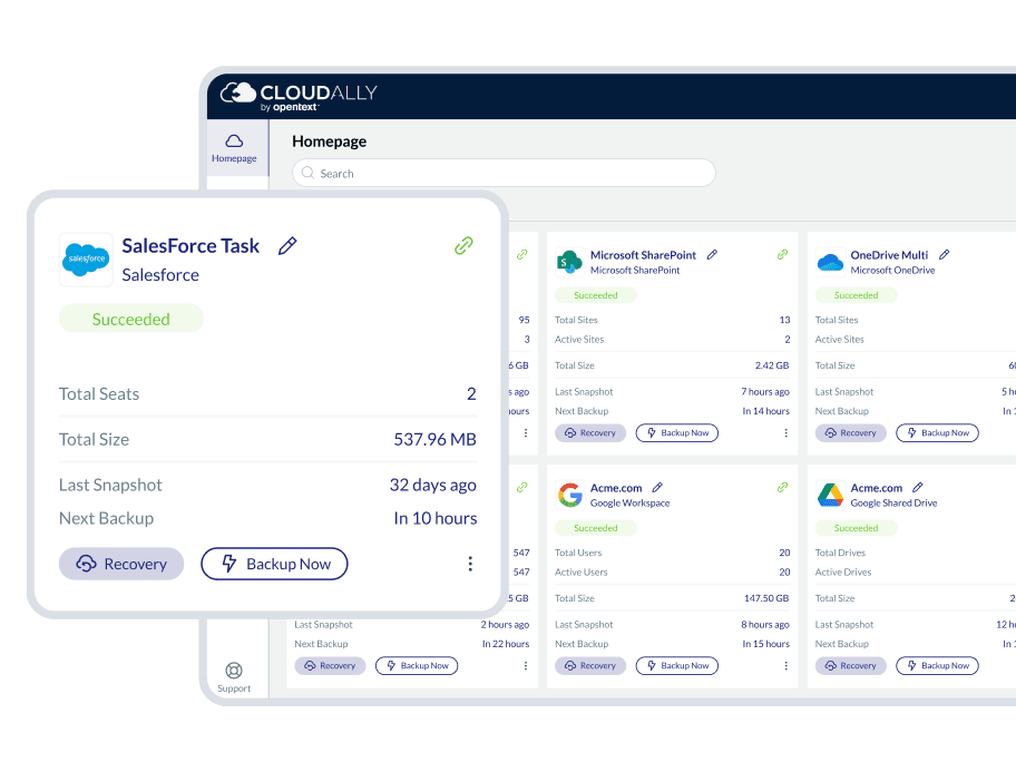 Our Salesforce backup integrates seamlessly with all Salesforce plans, giving you full control of your Salesforce data through a single OpenText Cloudally Backup account. Back up data from Production, Sandbox, and multiple Salesforce instances with ease. The intuitive user interface enables quick, out-of-the-box usage with two-click recovery. Salesforce administrators also benefit from advanced user management, customizable cloud-to-cloud backup settings, transparent status monitoring, email alerts, and detailed activity logs.